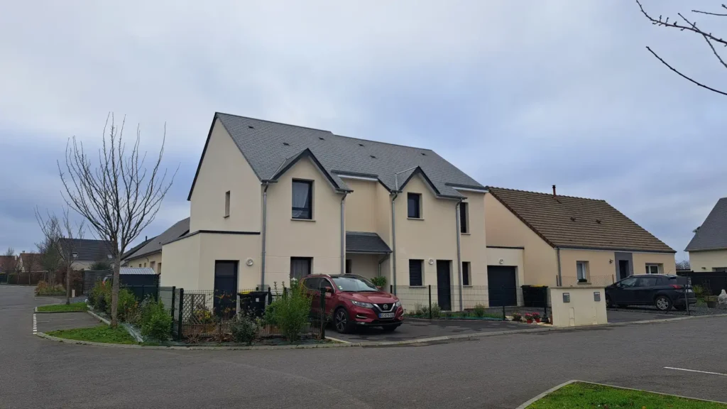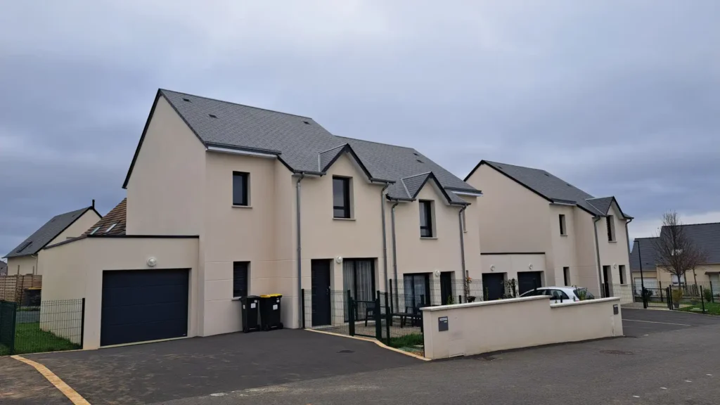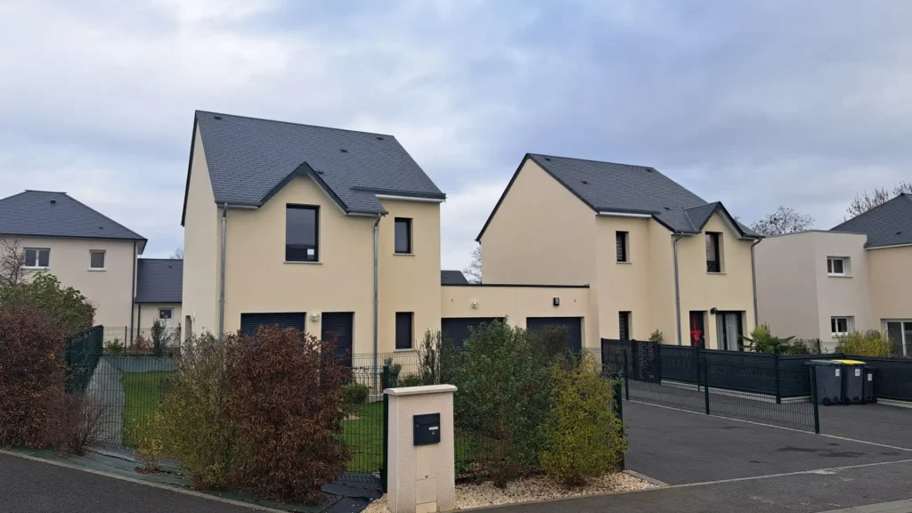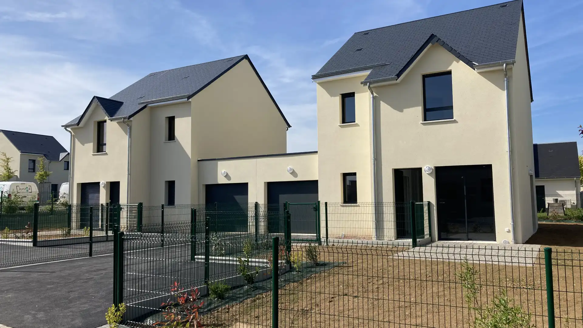 Chaque maison dispose d’un RDC au volume généreux, de 3 chambres à l’étage, d’un garage, d’une terrasse sur un jardin arboré délimité par une clôture grillagée doublée d’une haie champêtre d’essences locales et d’une place de stationnement non close.Une pompe à chaleur individuelle extérieure alimente chaque maison, les menuiseries extérieures sont en aluminium gris anthracite et dotées de volets roulants encastrés.
